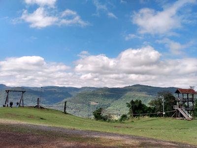 Balanço infinito, ponte pênsil, observatório, parquinho de crianças e amplo espaço com grama para contemplar a vista para o vale do Rio Cadeia.