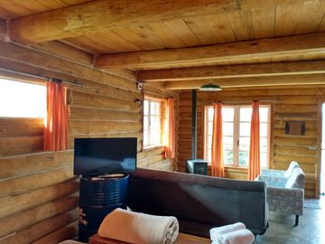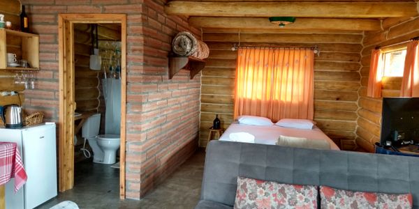 Cabana com 29m² construída com troncos retirados de uma das nossas propriedades. A acomodação possui rampa e banheiro acessível para cadeirantes, dispõe de Cama Queen com colchão de molas ensacadas individualmente, Sofá, Smart TV Sony, Ar Condicionado Digital Inverter Quente e Frio, Fogão a lenhaWiFi, Banheiro Privativo, Chaleira Elétrica, Frigobar, Mesa, deck e uma vista parcial para os morros.