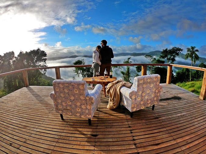Balanço infinito, ponte pênsil, observatório, parquinho de crianças e amplo espaço com grama para contemplar a vista para o vale do Rio Cadeia.