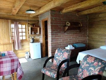 Cabana com 40m² construída com troncos retirados das nossas propriedades. A acomodação dispõe de Cama Queen com colchão de molas ensacadas individualmente, poltronas, Smart TV Sony, Ar Condicionado Digital Inverter Quente e Frio,, Lareira Canadense, Wi-fi, Banheiro Privativo, Chaleira Elétrica, Frigobar, Mesa e varanda coberta com uma vista encantadora para o vale da Joaneta.